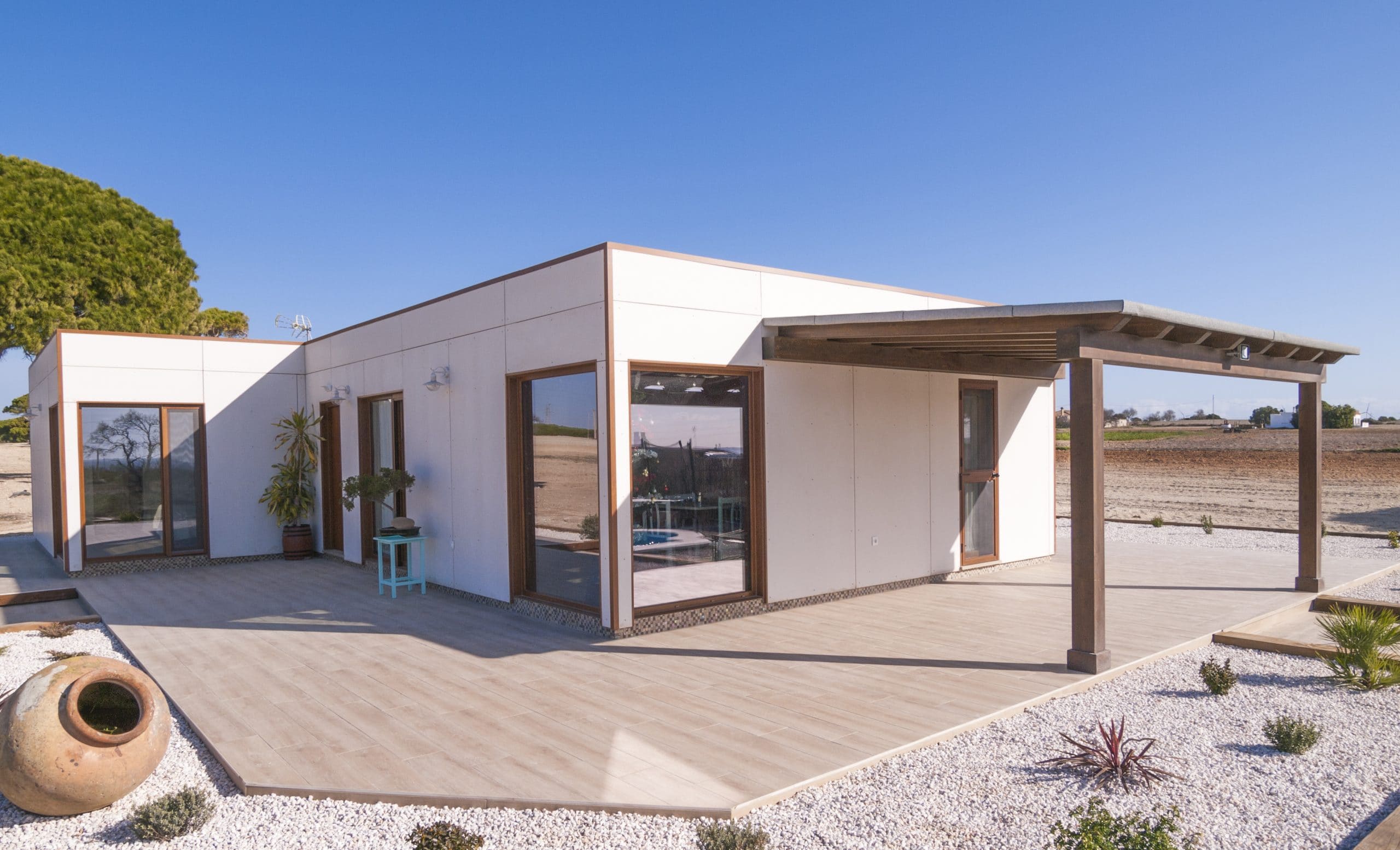 En el caso de una cimentación de madera y nivelación con grava, la vivienda comienza con una estructura de madera tratada colocada sobre la grava (imagen 01) y un tablero marino de carrocería de alta calidad (imagen 03), y por último el revestimiento de tarima flotante PVC resistente al agua o incluso baldosas.